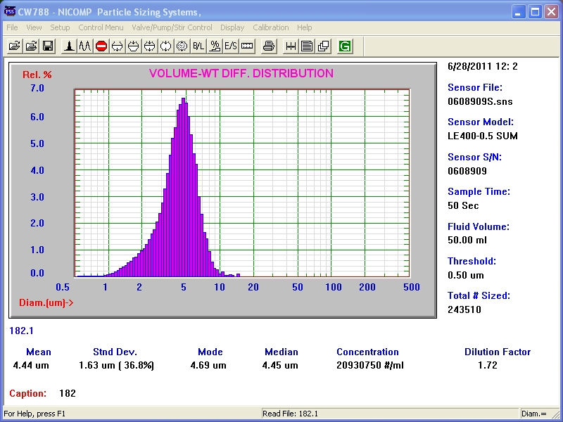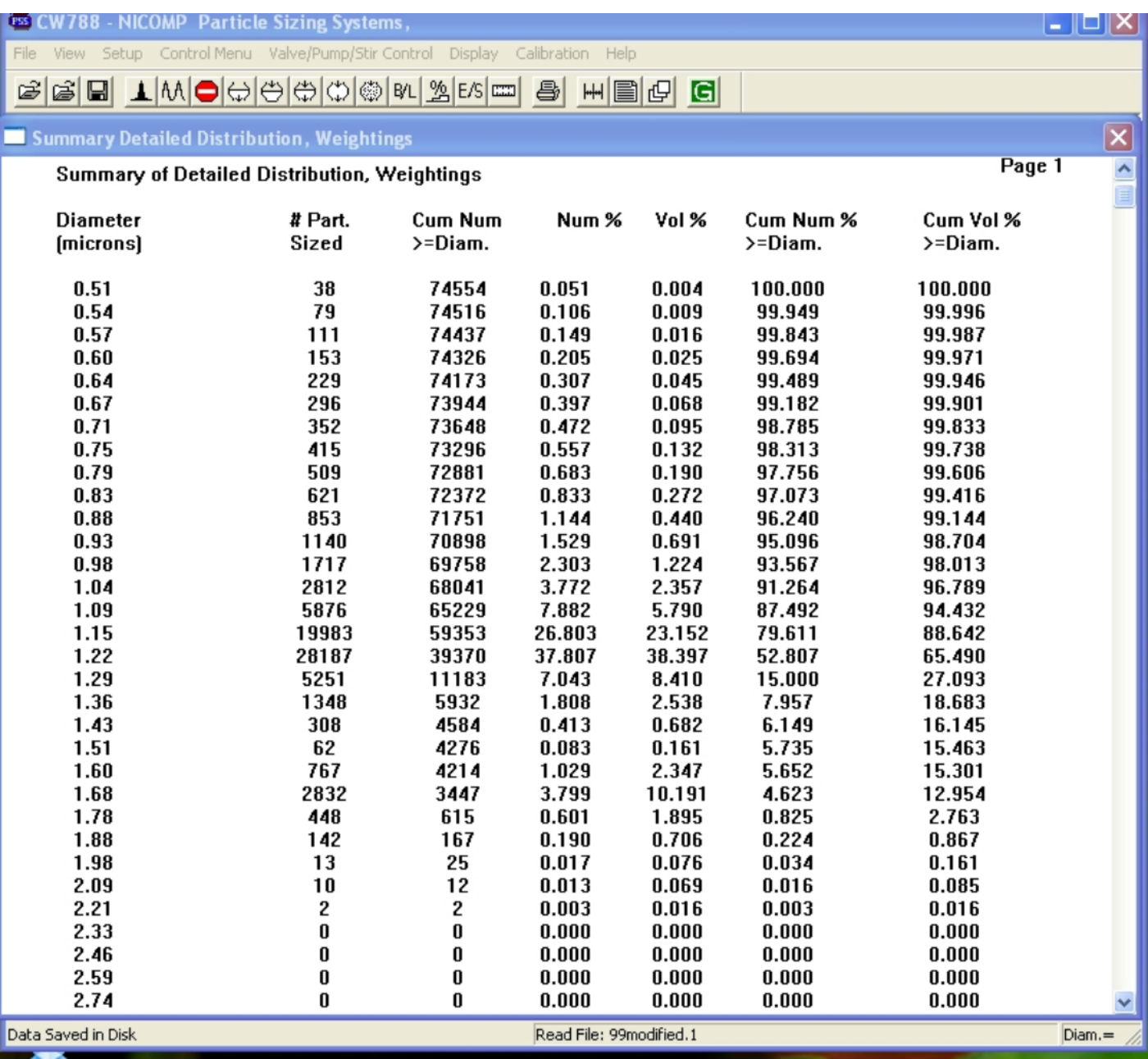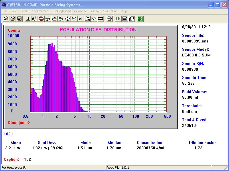 - Particle concentration (Particles/mL), Count distribution, area weighted distribution and volume weighted distribution in the range from 0.5 – 400 microns,5 – 2,500microns.