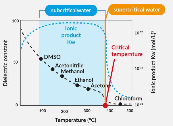 With increasing temperature subcritical water has greater solvating and diffusivity power than water. In this state it is an ideal extraction medium. Compared to supercritical CO2, subcritical water is an easier process to extract polar compounds. However, the compounds must have thermal stability at the higher temperatures compared to scCO2.